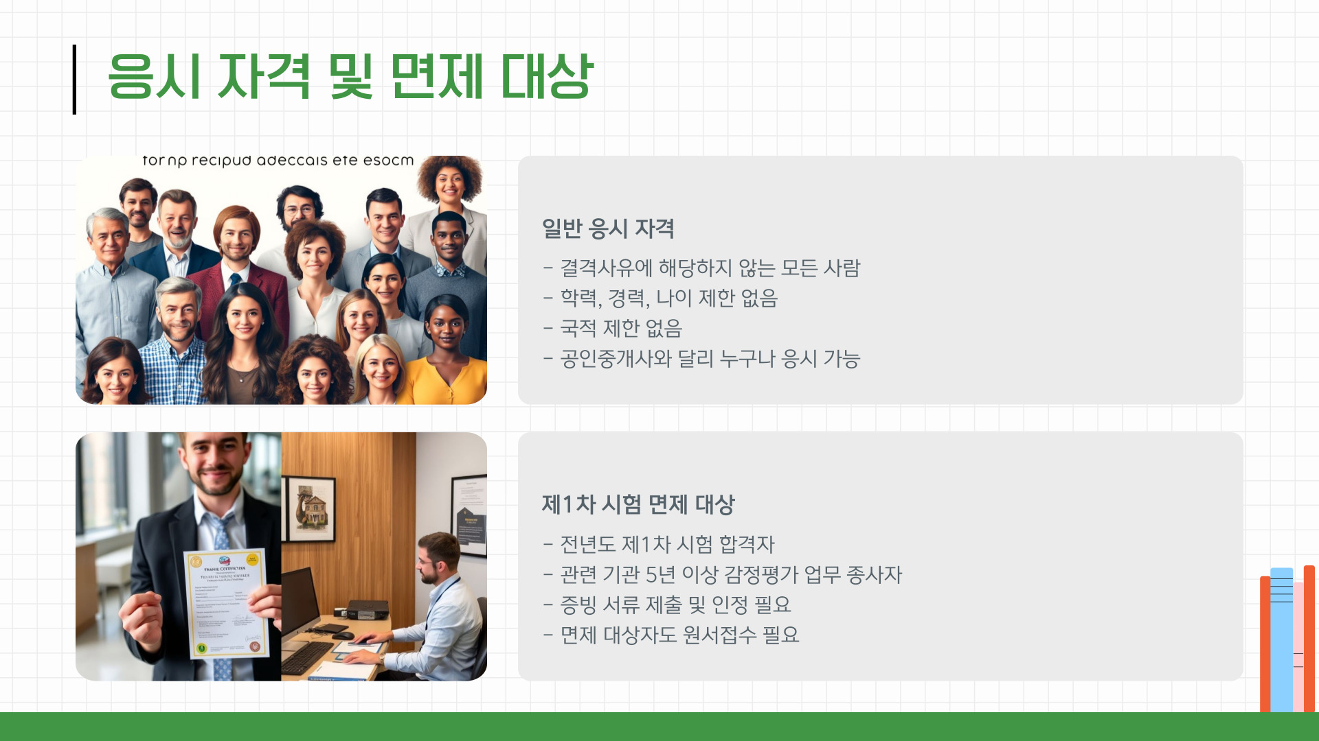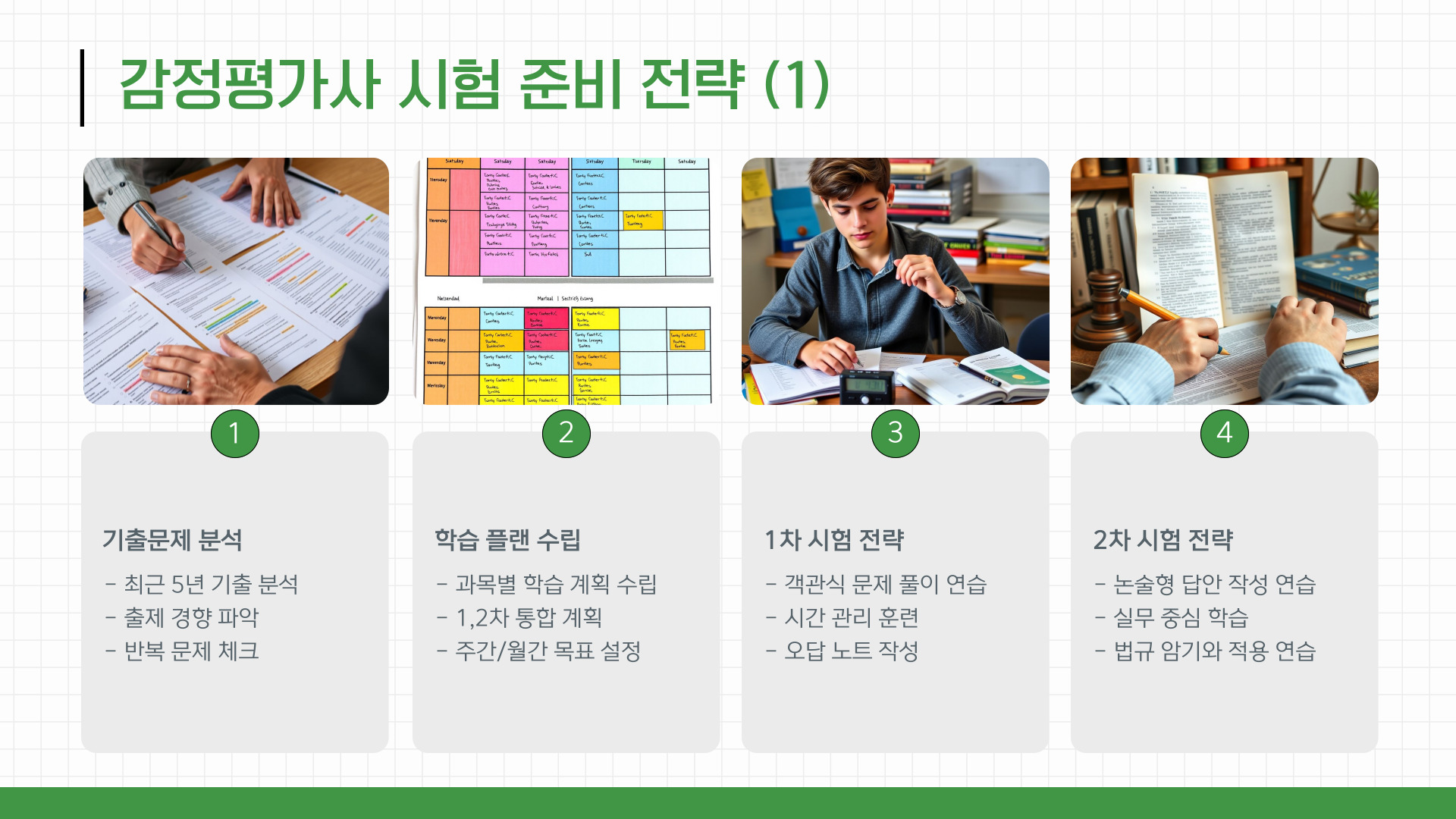 2025년 감정평가사 시험은 1차와 2차 모두 철저한 준비가 필요합니다. 일정과 요건을 미리 확인하고, 전략적으로 공부하여 합격을 목표로 하시기 바랍니다. 최신 시험 정보는 큐넷 감정평가사 홈페이지에서 확인하세요.