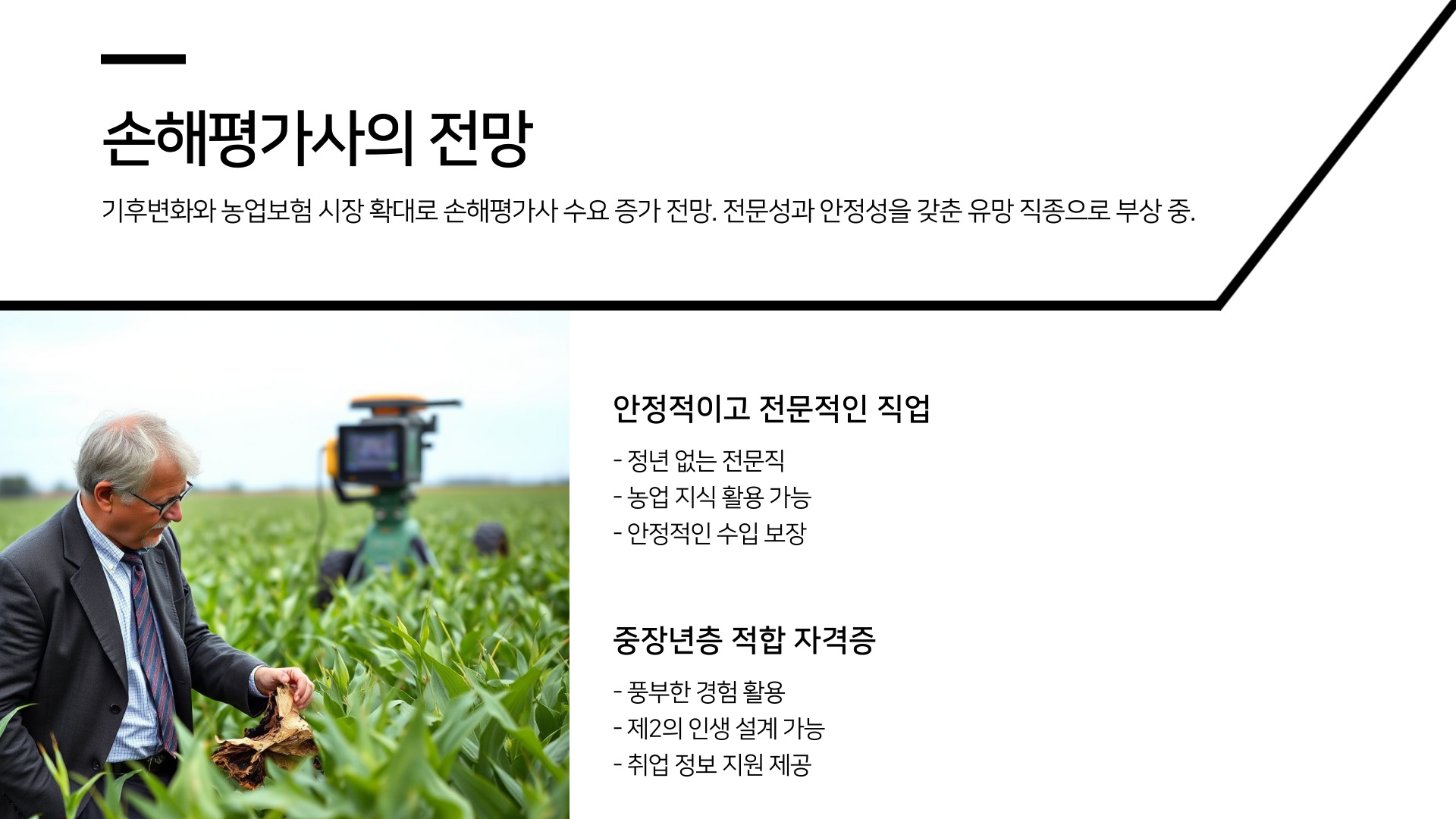 손해평가사는 **안정적인 전문직으로, 중장년층에게도 적합한 직업**입니다. 기후 변화와 농업재해 증가로 인해 그 중요성이 더욱 커지고 있으며, **지금 도전하면 향후 유망한 직업으로 자리 잡을 수 있습니다.**