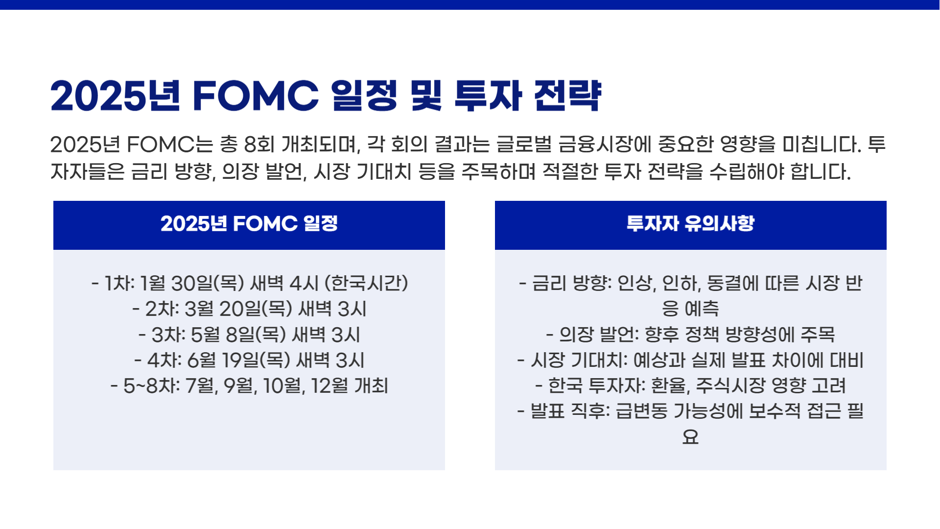 💡 FOMC 일정은 글로벌 투자자들의 ‘빅 이벤트’입니다. 발표 직후 주식·채권·외환시장에서 큰 폭의 변동성이 발생할 수 있으므로, 투자자들은 미리 대비 전략을 세워야 합니다.