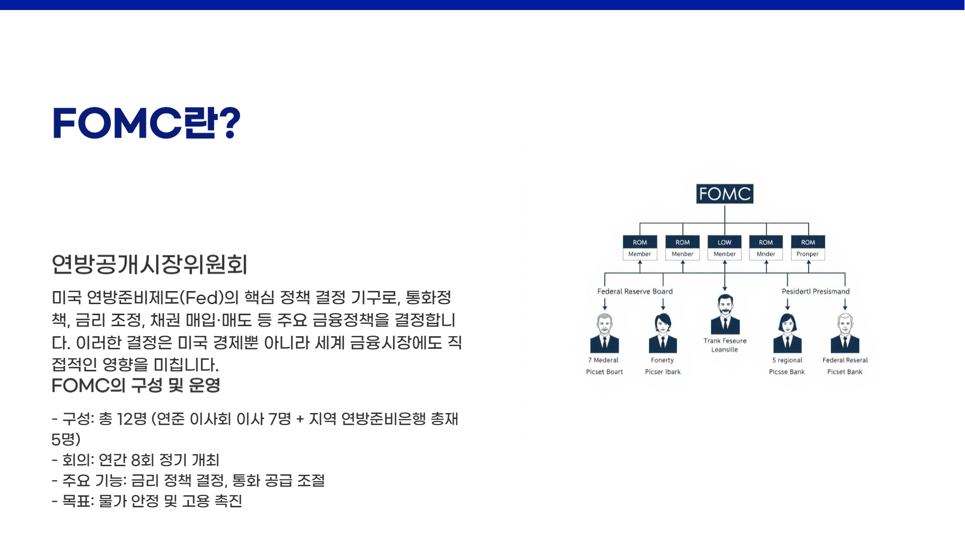 FOMC(Federal Open Market Committee, 연방공개시장위원회)는 미국 연방준비제도(Fed, 연준)의 핵심 정책 결정 기구입니다. 이곳에서 통화정책, 금리 조정, 채권 매입·매도 등 주요 금융정책이 결정되며, 미국 경제뿐 아니라 세계 금융시장에도 직접적인 영향을 미칩니다.